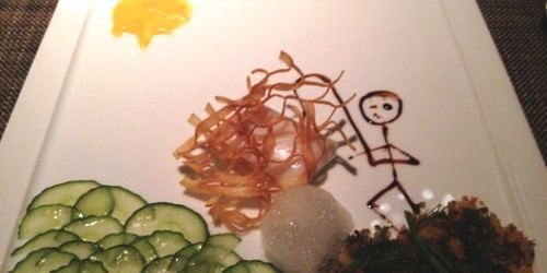 The sun beats down on the waves below as a girl on the shore lifts her fishing line up to see her catch… a giant walleye! The girl is drawn stick-figure on the flat china-white palette, she is balsamic, the sun is lemon coulis, the shore is tempura crumb, the waves are pickled cucumber, a nearby fried-potato fishing net leans on a freshly-caught, tender chunk of walleye.