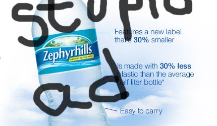 Take this soothing ad for Zephyrhills bottled water for instance. Any picklehead knows that plastic water bottles are on the top of the anti-environment list next to George W. Bush and Wal-Mart. Nothing makes me want to spend my beer money on this infamous wastemaker less than this ad that is literally trying to distract me from the polluting man behind the curtain.
